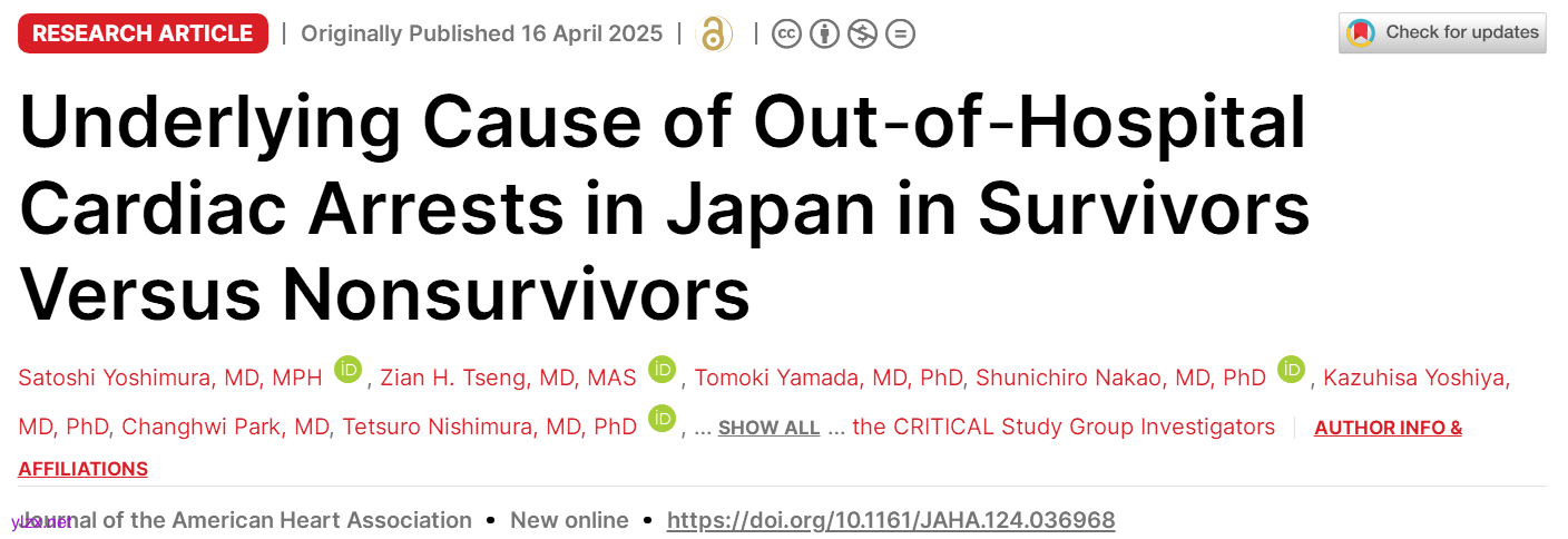 Satoshi Yoshimura,et al.Underlying Cause of Out‐of‐Hospital Cardiac Arrests in Japan in Survivors Versus Nonsurvivors.JAHA.2025.https://www.ahajournals.org/doi/10.1161/JAHA.124.036968