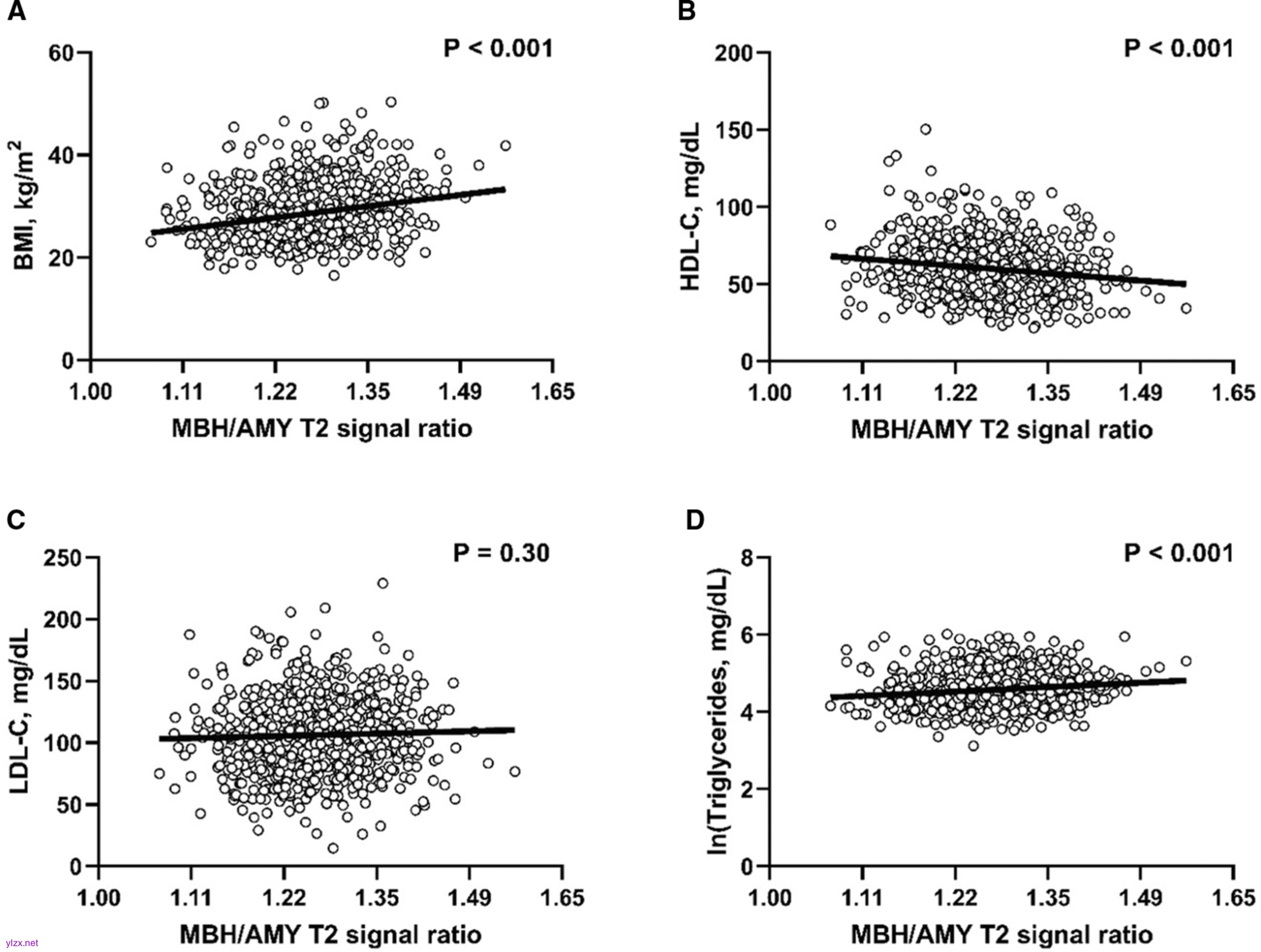 研究人员使用FHS (Framingham心脏研究)参与者的脑磁共振成像(N=867;平均年龄55岁;(55%女性),T2信号强度从双侧下丘脑中基底部(MBH)的感兴趣区域和杏仁核和壳核的参考区域提取。T2信号比被计算出来,T2信号相对强度越大表明胶质细胞形成。主要测量比较MBH和杏仁核(MBH/amygdala)。结局为体重指数、高密度脂蛋白胆固醇、低密度脂蛋白胆固醇、空腹甘油三酯、高血压(n=449)、糖尿病(n=66)、代谢综合征(n=254)或冠心病(n=25)。研究人员采用线性或逻辑回归进行统计检验。