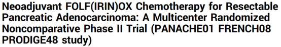 Schwarz, L., Bachet, J.-B., Meurisse, A., Bouché, O., Assenat, E., Piessen, G., Hammel, P., Regenet, N., Taieb, J., Turrini, O., Paye, F., Turpin, A., Souche, F.-R., Laurent, C., Kianmanesh, R., Michel, P., Vernerey, D., Mabrut, J.-Y., Turco, C., Truant, S., Sa Cunha, A., & Investigators, PANACHE01-FRENCH08-PRODIGE48 (2025). Neoadjuvant FOLF(IRIN)OX Chemotherapy for Resectable Pancreatic Adenocarcinoma: A Multicenter Randomized Noncomparative Phase II Trial (PANACHE01 FRENCH08 PRODIGE48 study). Journal of Clinical Oncology, 00(00), 1-13. https://doi.org/10.1200/JCO-24-01378.