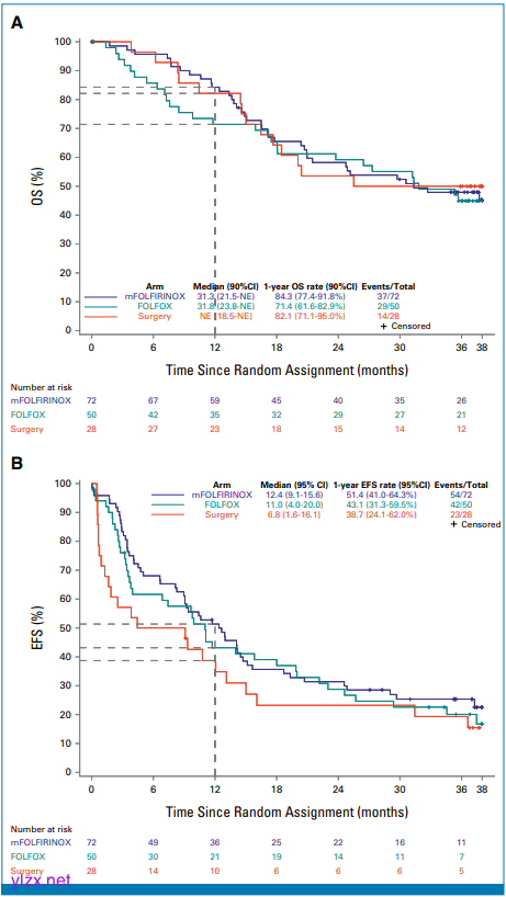 在意向治疗(ITT)人群中,mFOLFIRINOX组有70.8%的患者完成了整个治疗序列,而FOLFOX组和对照组分别为68%和50%。在随机分组后的12个月内,mFOLFIRINOX组、FOLFOX组和对照组的存活率分别为84.3%、71.4%和82.1%。mFOLFIRINOX组的一年无事件生存率(EFS)为51.4%,中位EFS为12.4个月;FOLFOX组的一年EFS为43.1%,中位EFS为11.0个月;对照组的一年EFS为38.7%,中位EFS为6.8个月。