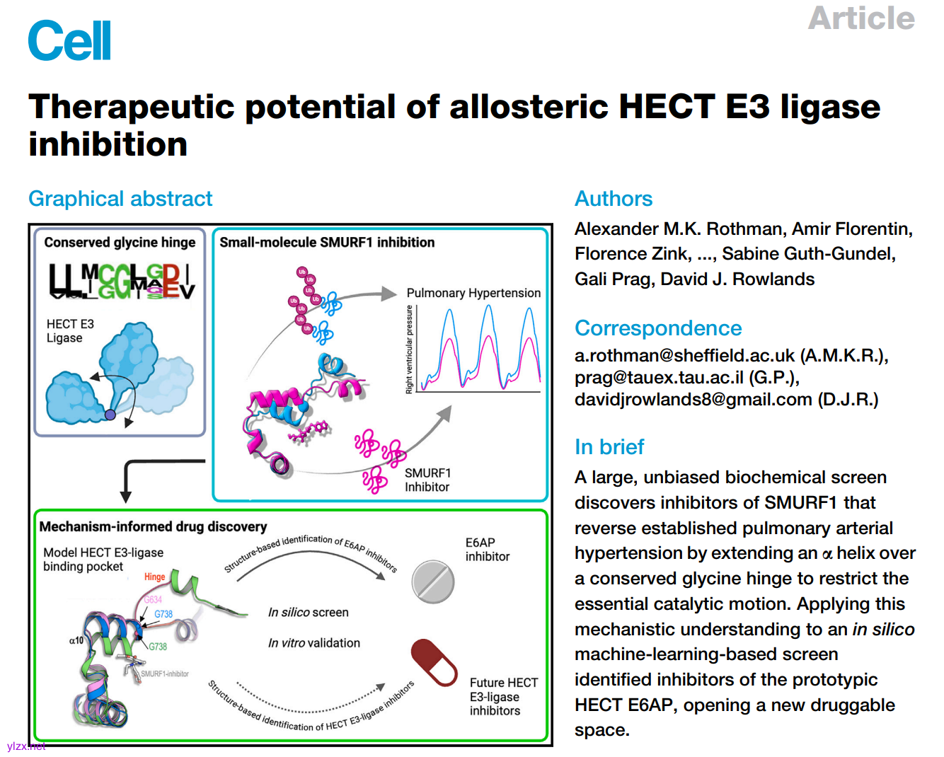 Rothman AMK, Florentin A, Zink F, Quigley C, Bonneau O, Hemmig R, Hachey A, Rejtar T, Thaker M, Jain R, Huang SM, Sutton D, Roger J, Zhang JH, Weiler S, Cotesta S, Ottl J, Srivastava S, Kordonsky A, Avishid R, Yariv E, Rathi R, Khvalevsky O, Troxler T, Binmahfooz SK, Kleifeld O, Morrell NW, Humbert M, Thomas MJ, Jarai G, Beckwith REJ, Cobb JS, Smith N, Ostermann N, Tallarico J, Shaw D, Guth-Gundel S, Prag G, Rowlands DJ. Therapeutic potential of allosteric HECT E3 ligase inhibition. Cell. 2025 Apr 2:S0092-8674(25)00274-0. doi: 10.1016/j.cell.2025.03.001. Epub ahead of print. PMID: 40179885.