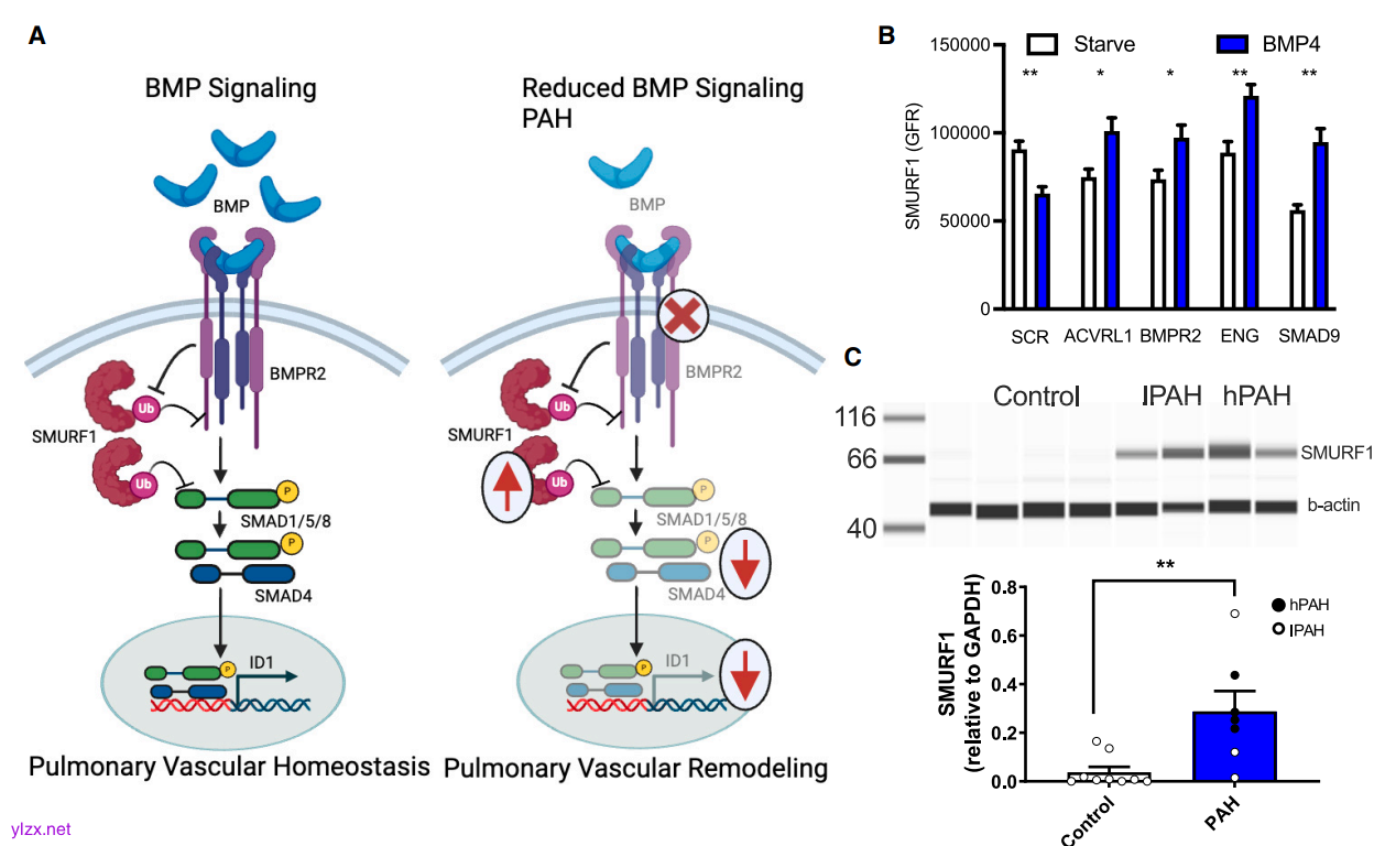 在动物实验中,研究人员将该抑制剂用于治疗实验性肺动脉高压模型,结果非常惊喜。肺动脉高压是一种罕见但致命的疾病,主要由肺动脉内压力升高引起,最终可能导致心力衰竭。部分病人由于BMPR2(骨形态发生蛋白受体2)基因突变,导致BMP信号通路异常,而SMURF1则在这个过程中“推波助澜”,进一步破坏该信号系统。
