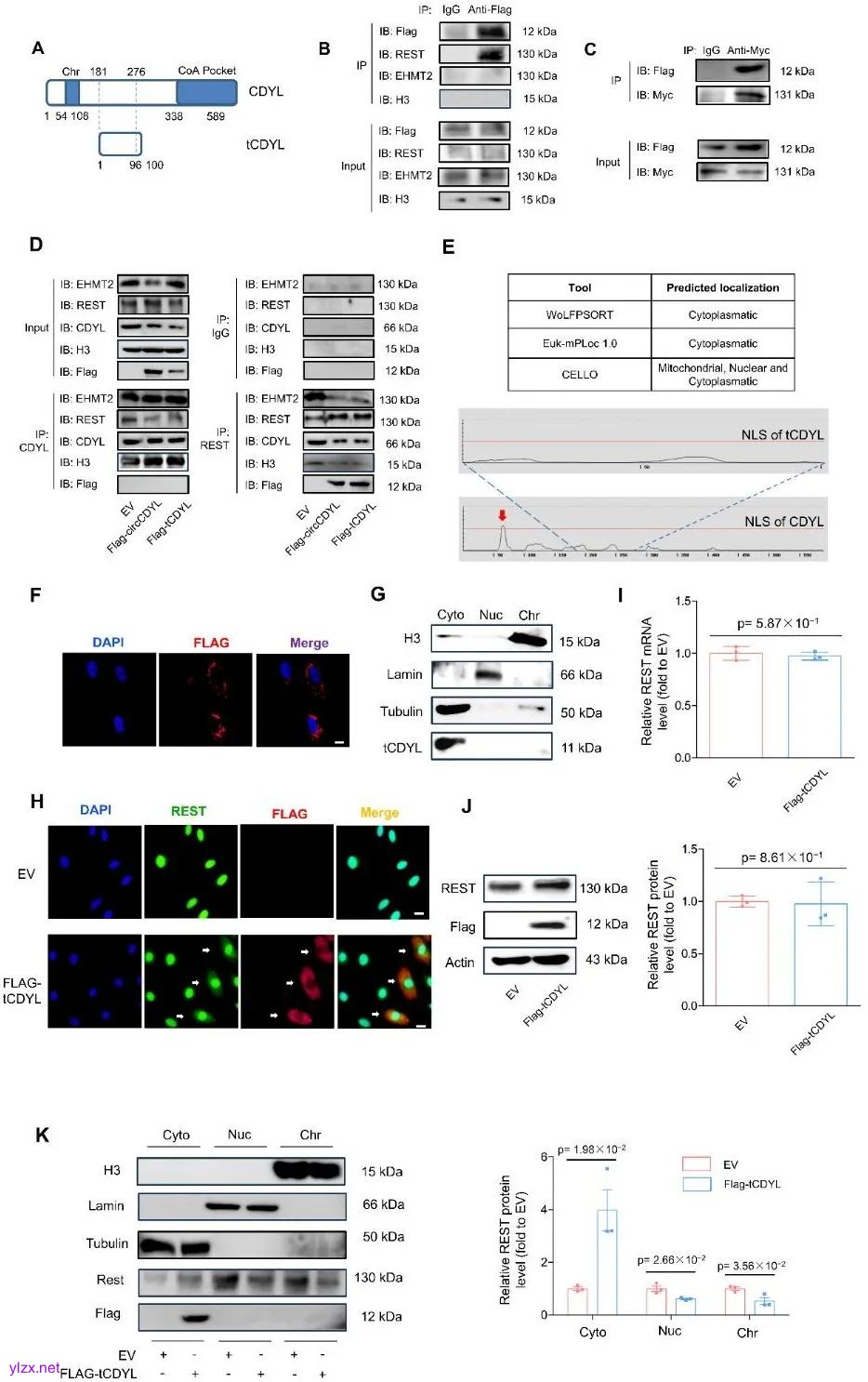 机制上,circCDYL并不能作为典型的miRNA海绵或蛋白支架发挥作用。研究者发现circCDYL序列中存在一个保守的潜在ORF,可能编码一条长度为100 aa的多肽-tCDYL-100,其序列与CDYL (Chromodomain Y-like)蛋白高度重合。为了验证circCDYL能否编码tCDYL-100,研究者对circCDYL表达载体进行改造,在该潜在ORF终止密码子前融合了Flag-tag编码序列。利用Flag抗体可通过免疫印迹在转染此改造载体的细胞中检测到与推定的Flag-tCDYL-100分子量一致的蛋白的表达,同时通过质谱分析从对应的蛋白条带中鉴定出tCDYL的肽段。而突变ORF中的起始密码子后则无法检测到此蛋白的表达。研究者还制备了tCDYL-100多克隆抗体,通过免疫印迹在心肌细胞中检测到了内源性tCDYL-100的表达,而且tCDYL-100的表达量在转染circCDYL表达载体后显著提升,由此证明了circCDYL在心肌细胞中可翻译生成tCDYL-100。研究进一步发现,circCDYL的翻译过程受m6A修饰调控:心肌细胞受到病理刺激后circCDYL发生m6A修饰,成为翻译模板,在YTHDF3介导下激活tCDYL-100的表达。当突变起始密码子上游保守的m6A修饰位点或以m6A抑制剂环亮氨酸处理细胞后,tCDYL-100表达受到显著抑制。tCDYL-100定位于心肌细胞的细胞质中,通过与CDYL竞争结合转录共抑制因子REST (RE1-silencing transcription factor),阻止REST进入细胞核以及REST-CDYL-EHMT2 (Euchromatic histone-lysine N-methyltransferase 2)复合物的形成,最终导致促心肌肥大相关基因rhoa和nppb启动子区域H3K9甲基化修饰水平的降低,从而激活基因的转录。