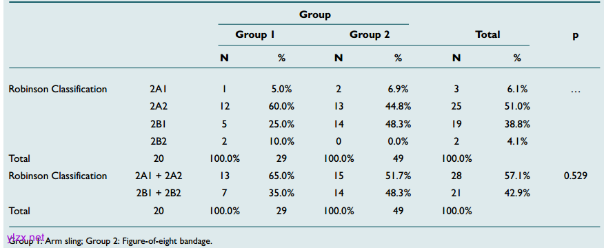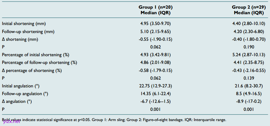 方法:根据患者偏好的保守治疗方法将其分为两组:第1组(手臂吊带组)和第2组(“8”字绷带组)。在初次就诊时和随访期间测量骨折的成角程度和短缩程度。比较两组患者的人口统计学特征和影像学数据。