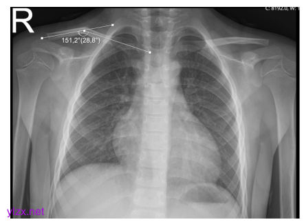 锁骨角度测量示例。通过测量穿过骨折锁骨髓质中点的线之间的角度来确定角度。
