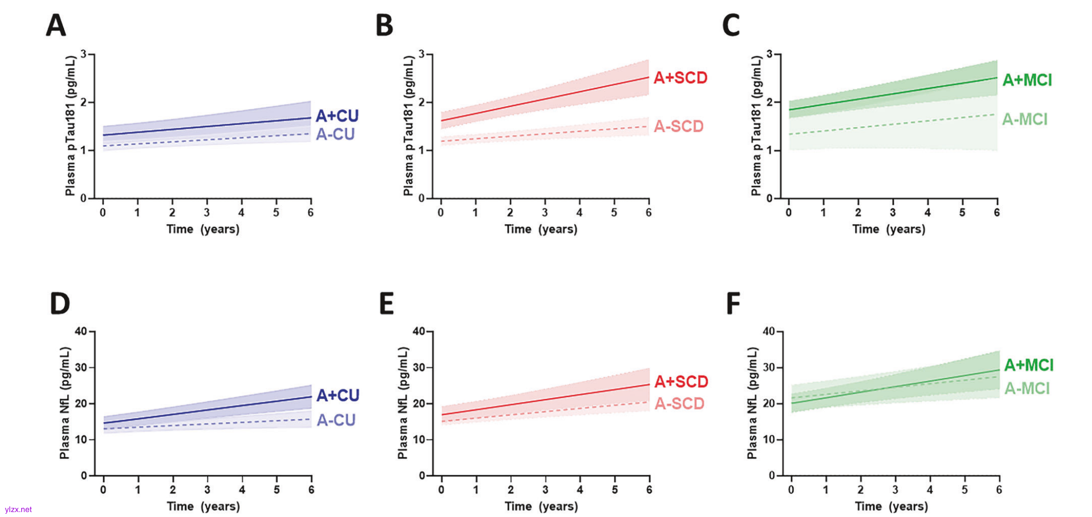 图2:A+SCD和A+MCI患者血浆p181水平随时间增长更快,而NfL变化率在各组间相似