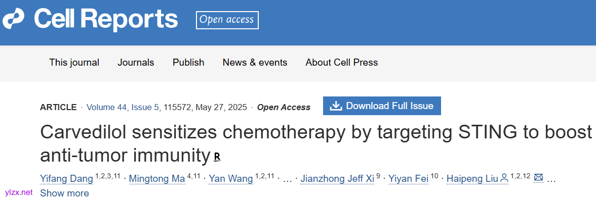 Dang Y, Ma M, Wang Y, Zhao M, Cao Y, Su H, Liu T, Zheng M, Gao J, Wu X, Xu J, Chen L, Xi JJ, Fei Y, Liu H. Carvedilol sensitizes chemotherapy by targeting STING to boost anti-tumor immunity. Cell Rep. 2025 Apr 16;44(5):115572. doi: 10.1016/j.celrep.2025.115572. Epub ahead of print. PMID: 40249703.