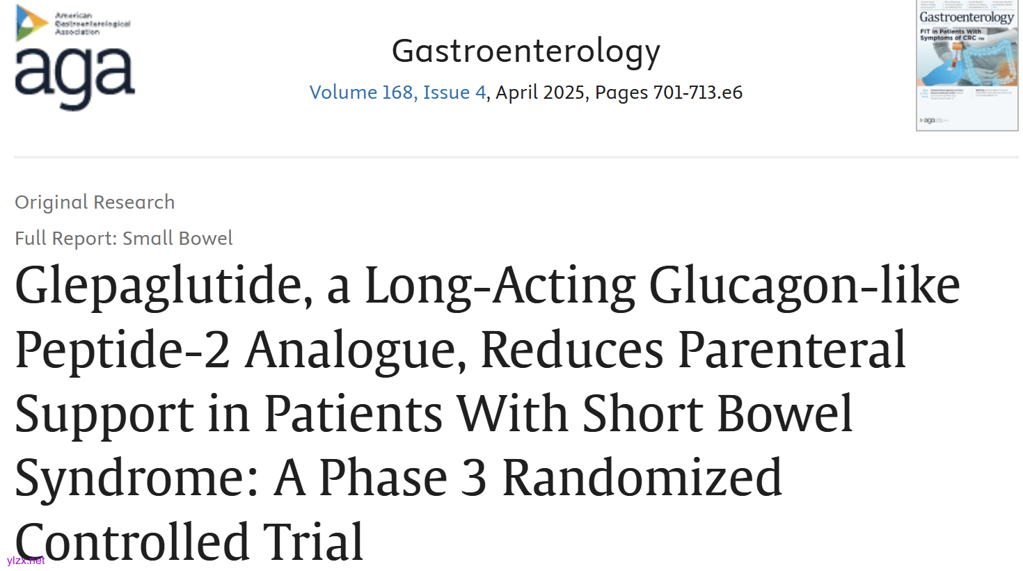 Gastroenterology:长效胰高血糖素样肽-2 类似物Glepaglutide可减少短肠综合征患者的肠外支持