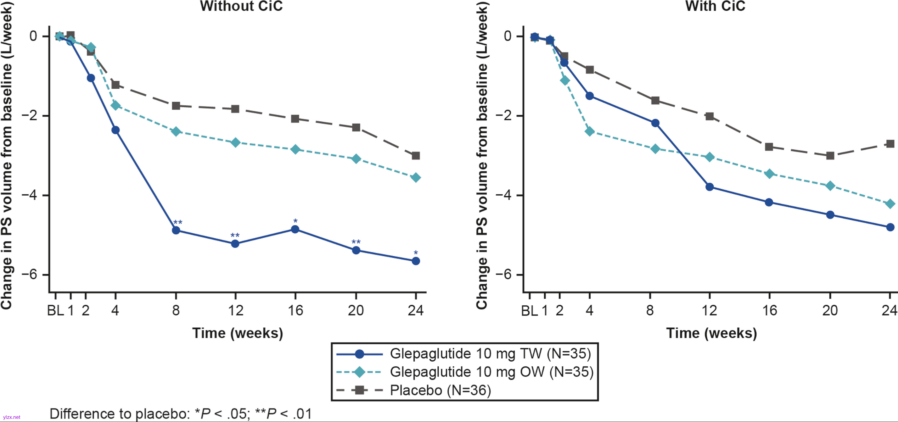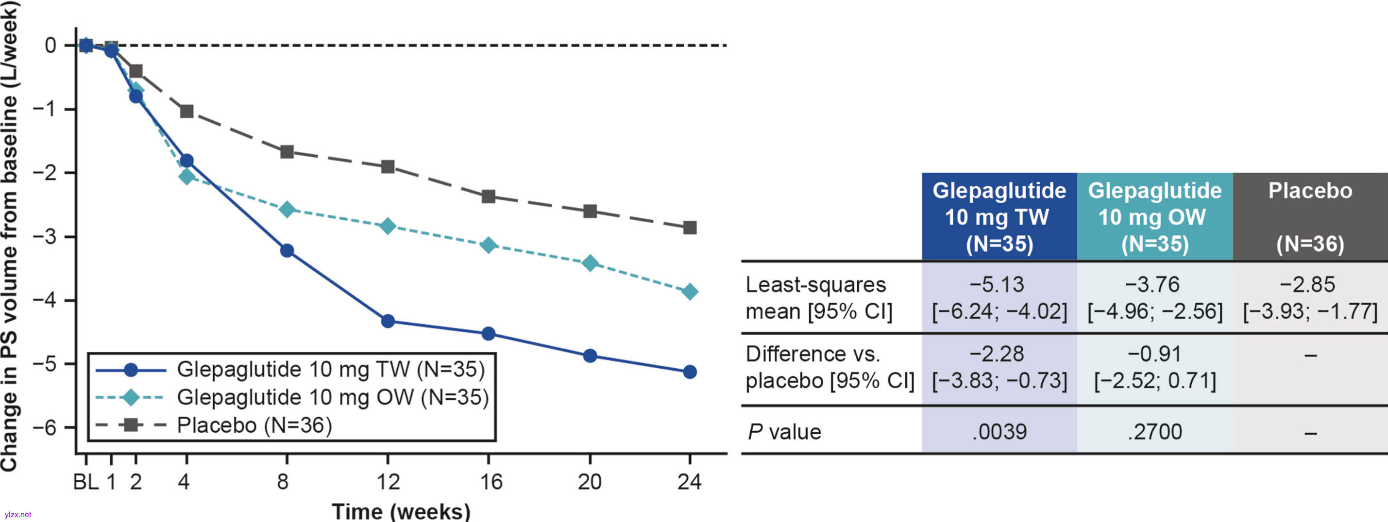 图3 各次就诊和主要解剖亚组的 PS 容量(每周升)与基线(BL)相比的变化