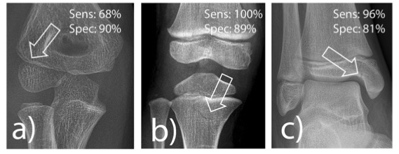 在我们的队列中(中位年龄 10.9 岁,59% 为男性),该人工智能表现出 92% 的敏感性、83% 的特异性和 87% 的准确性。对于具有法医学相关性的骨折,该人工智能对胫骨近端骨折的敏感性达到了 100%,但对桡骨髁骨折的敏感性仅为 68%。人工智能辅助将住院医师基于患者的敏感性从 84% 提高到 87%,特异性从 91% 提高到 92%,诊断准确性从 88% 提高到 90%。在 2% 的病例中,阅片者在人工智能的辅助下错误地放弃了他们原本正确的诊断。