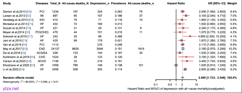 全部39项研究均报告了心血管疾病患者的抑郁症患病率,其中10项研究报告了焦虑症的患病率, 15项研究检查了抑郁症状和全因死亡率。研究结果显示,心血管疾病患者抑郁症的总体估计患病率为20.8%(95% CI:17.3–25.1%)。亚组分析显示,冠心病患者的抑郁症患病率为19.8%(95% CI:16.0–24.6%),心力衰竭患者为24.7%(95% CI:17.9–34.3%)。在随机效应模型中,与非抑郁患者相比,抑郁症状与未调整的全因死亡率增加相关(风险比=2.095,95% CI:1.723–2.546)。