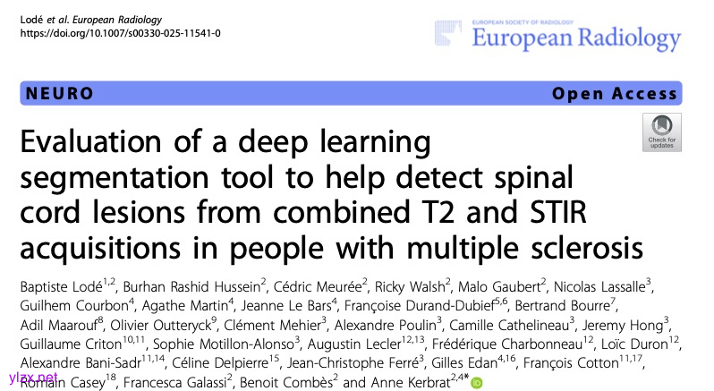 Baptiste Lodé,Burhan Rashid Hussein,Cédric Meurée,et al.Evaluation of a deep learning segmentation tool to help detect spinal cord lesions from combined T2 and STIR acquisitions in people with multiple sclerosis.DOI:10.1007/s00330-025-11541-0