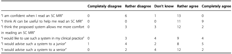 基于法国多发性硬化症登记处(OFSEP)影像数据库中的脊髓矢状位 T2 加权序列和 STIR 序列的扫描数据开发了一个深度学习工具,该数据库包含来自 40 台不同扫描仪的回顾性数据。在 2023 年 12 月至 2024 年 6 月期间,基于回顾性数据进行了一项多阅片者研究,以比较 20 名临床医生在使用和不使用该工具的情况下,解读脊髓上部和下部扫描图像的性能。由三名专家确定了金标准。对敏感性、准确性和阅片者之间的变异性进行了评估。