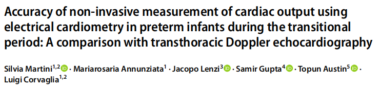 Silvia Martini, Mariarosaria Annunziata, et al. Accuracy of non‑invasive measurement of cardiac output using electrical cardiometry in preterm infants during the transitional period: A comparison with transthoracic Doppler echocardiography, European Journal of Pediatrics, 2025, https://doi.org/10.1007/s00431-025-06132-6.