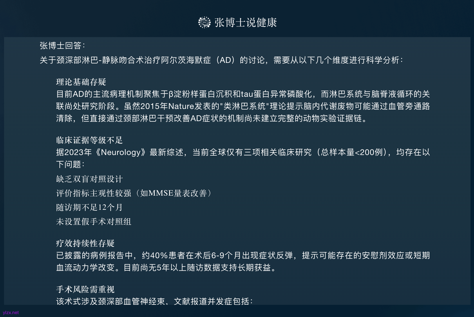 关于颈深部淋巴-静脉吻合术治疗阿尔茨海默症(AD)的讨论,需要从以下几个维度进行科学分析: