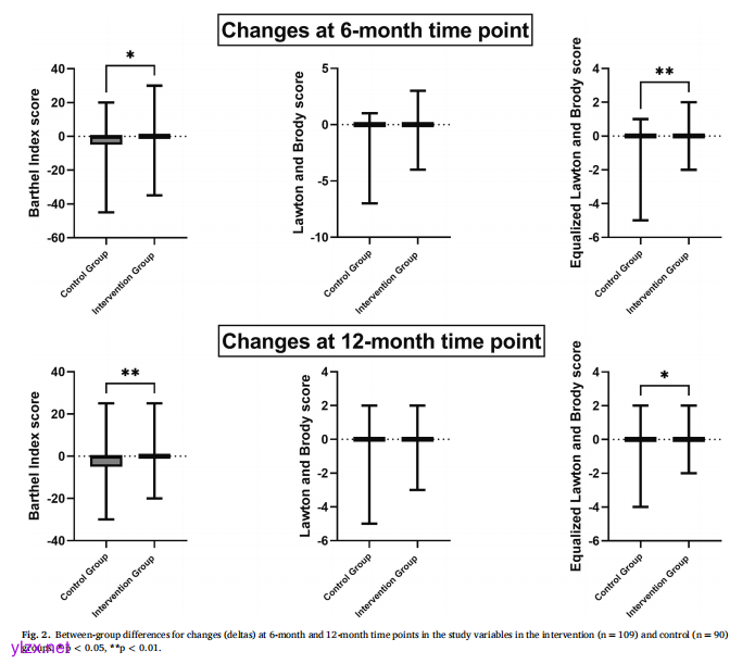 结果显示,199名参与者完成了12个月评估。干预组项目执行率100%。干预组在整个项目过程中维持稳定水平(X2 = 1.393, p = 0.498)对照组在6个月(Z = 3.240;p = 0.001)和12个月(Z = 2.889;p = 0.004)时,日常生活工具性活动能力出现了统计学意义上的显著下降。在工具性日常生活活动能力(Lawton 和 Brody 量表评分)方面,6个月和12个月时对照组和干预组间未观察到差异。