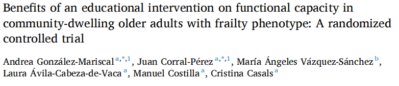 Andrea Gonz´alez-Mariscal, Juan Corral-P´erez, et al. Benefits of an educational intervention on functional capacity in community-dwelling older adults with frailty phenotype: A randomized controlled trial, International Journal of Nursing Studies, 2025, https://doi.org/10.1016/j.ijnurstu.2024.104955.