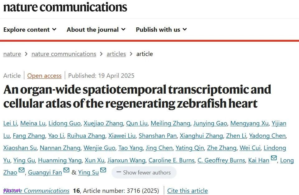 Nat Commun 苏颖/赵龙/范广益/韩凯团队合作解析斑马鱼心脏再生全过程的高分辨率时空动态图谱