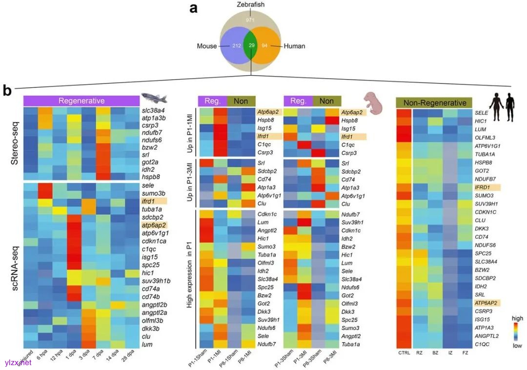 鉴于不同物种的心脏再生能力存在明显差异,联合团队还创新性对比了心脏可再生组(成体斑马鱼和出生后1天的乳(小)鼠)与不可再生组(出生后8天的乳(小)鼠和人类)的心脏损伤响应特征,鉴定了ifrd1与atp6ap2等基因在可再生心脏中特异性激活,而在不可再生心脏的哺乳动物心肌中呈现沉默状态。这一发现为临床心血管疾病治疗研究提供了潜在的靶标。