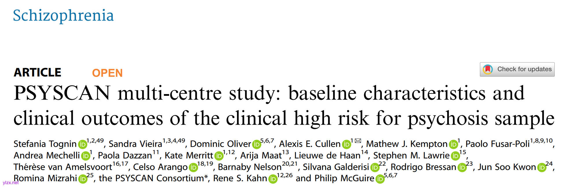 Tognin, S., Vieira, S., Oliver, D., et al. (2025). PSYSCAN multi-centre study: baseline characteristics and clinical outcomes of the clinical high risk for psychosis sample. *Schizophrenia*, *11*(1), 66. https://doi.org/10.1038/s41537-025-00598-x