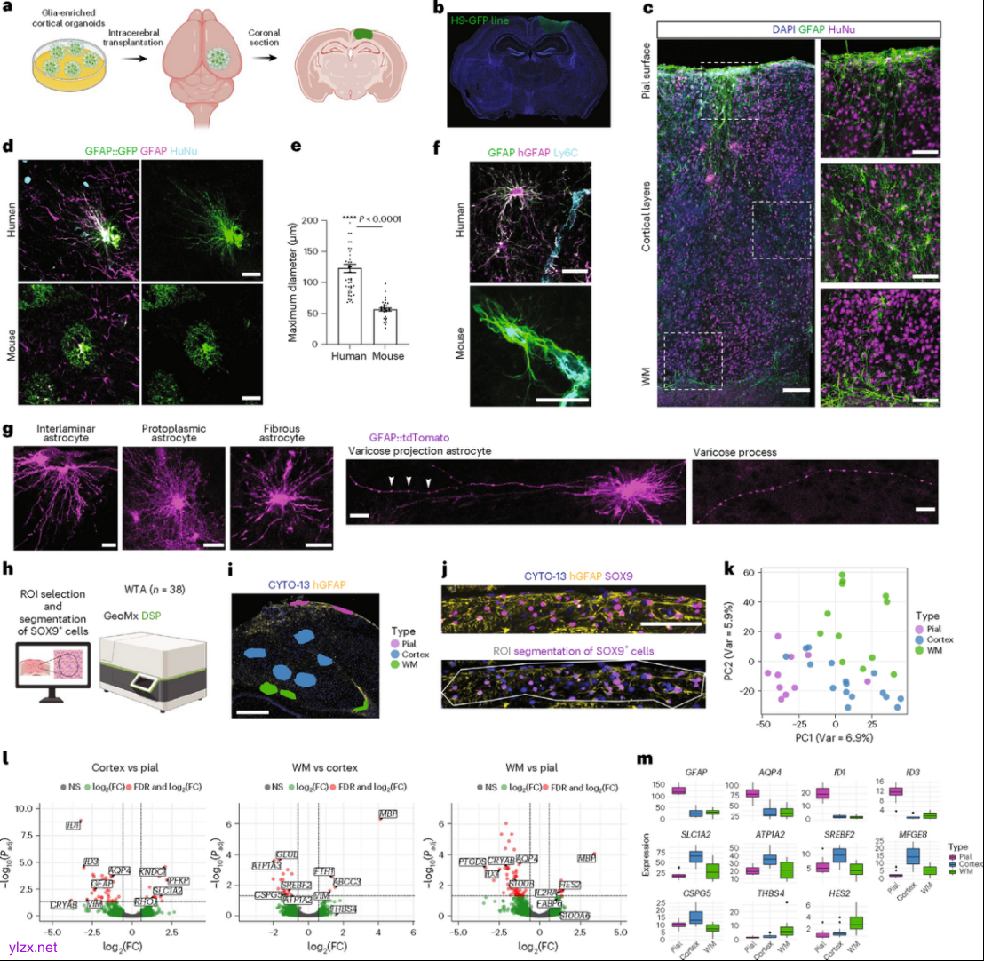 研究通过在分化 3 周时触发类器官中 28-33% 的细胞的胶质发生开关,在分化 8-10 周时实现了占细胞群 25-31% 的星形胶质细胞的有效衍生。为了研究大脑环境中的星形胶质细胞功能,使用脑内移植方法,该方法产生了高度血管化的体内脑类器官。类器官移植显示出与宿主大脑的稳健整合,并开发了解剖学上定义的人类星形胶质细胞形态亚类。空间基因组学进一步揭示了人类星形胶质细胞不同亚类之间的层特异性分子特征。血管周围星形胶质细胞终足的形成,包裹移植物内的血管。使用单核 RNA 测序,发现与皮质类器官移植相比,类器官移植中星形胶质细胞成熟提前。在急性神经炎症的体内模型中,与急性反应性相关的差异表达基因在星形胶质细胞亚群中表现出显着的异质性。