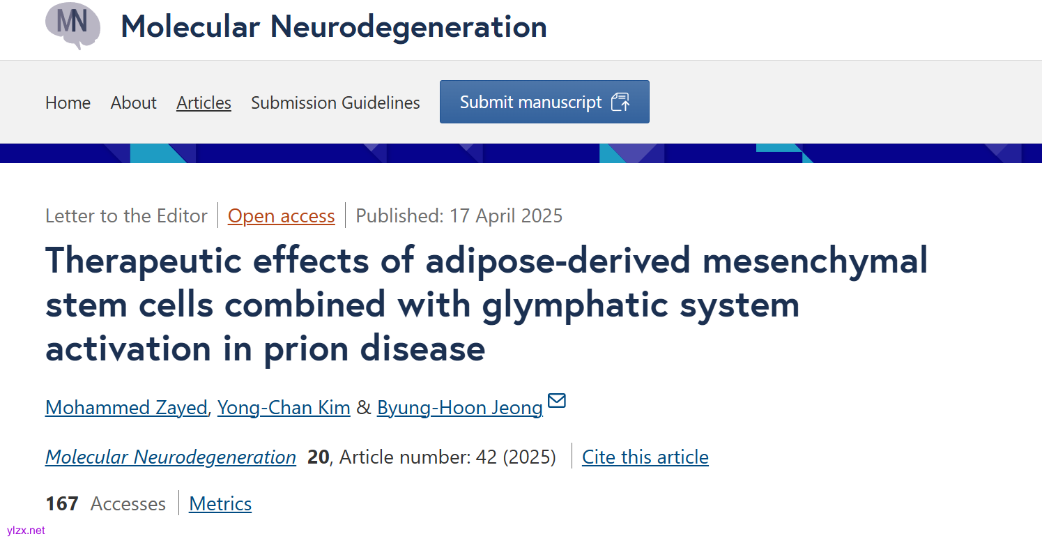 Zayed, M., Kim, YC., & Jeong, BH. (2025). Therapeutic effects of adipose-derived mesenchymal stem cells combined with glymphatic system activation in prion disease. Molecular Neurodegeneration, 20(1), 42. https://doi.org/10.1186/s13024-025-00835-y