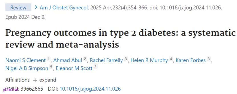 Clement NS, Abul A, Farrelly R, Murphy HR, Forbes K, Simpson NAB, Scott EM. Pregnancy outcomes in type 2 diabetes: a systematic review and meta-analysis. Am J Obstet Gynecol. 2025 Apr;232(4):354-366. doi: 10.1016/j.ajog.2024.11.026. Epub 2024 Dec 9. PMID: 39662865.