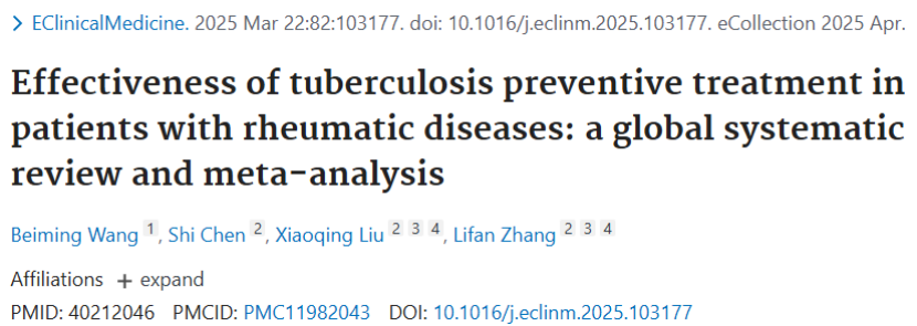 EClinicalMedicine:我国学者发文结核病预防性治疗显著降低风湿病患者结核感染风险