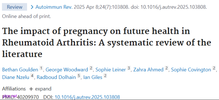 Goulden B, Woodward G, Leiner S, Ahmed Z, Covington S, Nzelu D, Dolhain R, Giles I. The impact of pregnancy on future health in Rheumatoid Arthritis: A systematic review of the literature. Autoimmun Rev. 2025 Apr 8;24(7):103808. doi: 10.1016/j.autrev.2025.103808. Epub ahead of print. PMID: 40209970.