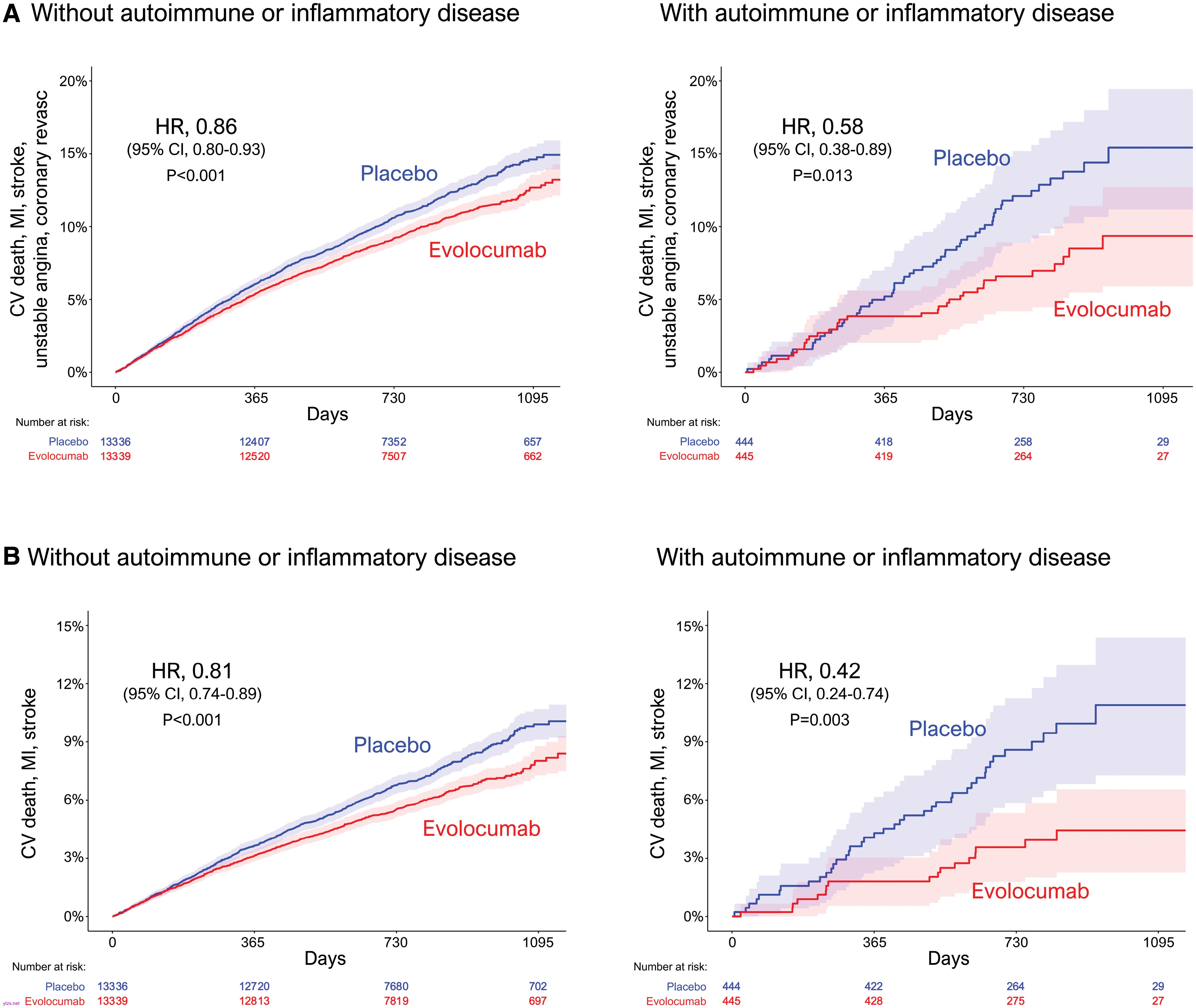 基线时,889例患者(3.2%)患有AIID,最常见的是类风湿关节炎(33.7%)或牛皮癣(15.6%)。在有或没有AIID的患者中,低密度脂蛋白胆固醇水平的中位数(四分位数范围)分别为90.0 mg/dL(79.5-105.5)和91.5 mg/dL (79.5-108.5) (P=0.025),经安慰剂调整后evolocumab组降低百分比是一致的(60.2% vs 59.0%;P=0.57)。AIID患者的基线hsCRP较高(中位数为2.1 vs 1.7 mg/L;P<0.001),并且在两组中使用evolocumab均无显著变化。与安慰剂相比,evolocumab使无AIID患者的主要终点率降低了14%(风险比为0.86 [95%CI为0.80-0.93]),使有AIID患者的主要终点率降低了42%(风险比为0.58 [95%CI为0.38-0.89]);相互作用P=0.066)。同样,evolocumab使无AIID患者心血管死亡、心肌梗死或卒中的关键次要终点降低19%(风险比为0.81 [95%CI为0.74-0.89]),使有AIID患者降低58%(风险比为0.42 [95%CI为0.24-0.74]);相互作用P=0.022)。