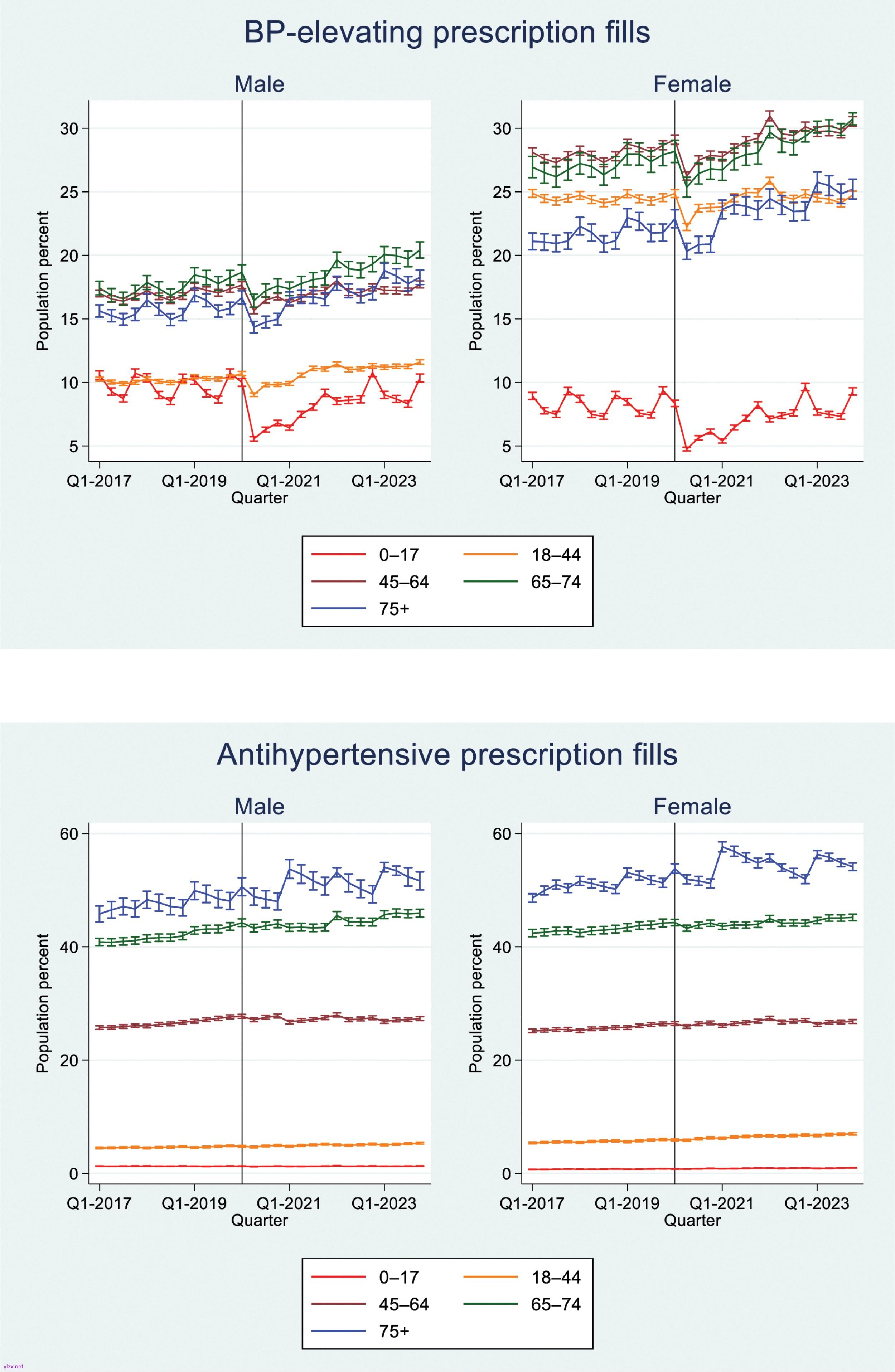 研究人员使用IQVIA患者总追踪数据库的全国样本,报告了同时和单独填充血压升高和降压药的季度趋势,覆盖了美国所有零售处方的94%。研究人员确定了1387种产品含有升高血压的药物,240种产品含有抗高血压药物。此外,研究人员使用2017年第一季度的百分比变化和连接点回归的平均季度百分比变化来呈现总体趋势,并按性别和年龄组(0-17岁、18-44岁、45-64岁、65-74岁和≥75岁)划分。