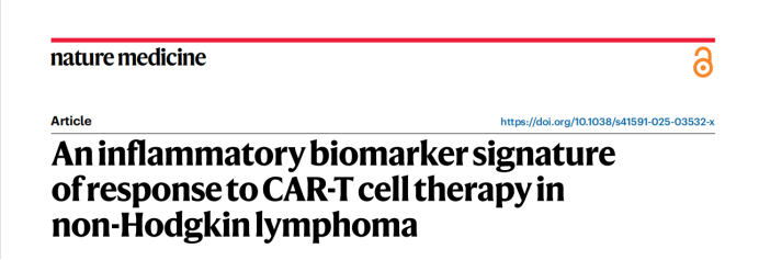 An inflammatory biomarker signature of response to CAR-T cell therapy in non-Hodgkin lymphoma. Nat Med. 2025 Apr;31(4):1183-1194. doi: 10.1038/s41591-025-03532-x. Epub 2025 Apr 1. PMID: 40169864; PMCID: PMC12003198.
