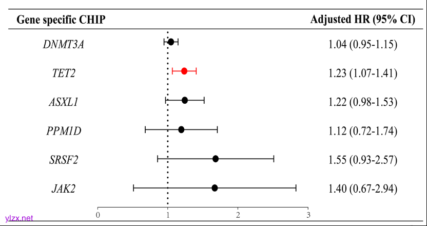 图1:与无CHIP的个体相比,具有基因特异性CHIP的个体发生AITD的风险比及95% CI