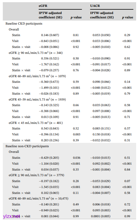 基于逆概率治疗加权(IPTW)调整的线性混合效应模型分析基线有无慢性肾脏病的参与者中他汀类药物使用与未使用对估算肾小球滤过率(eGFR)及尿白蛋白-肌酐比值(UACR)变化的关联