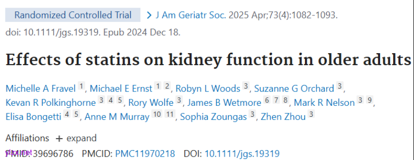 Fravel MA, Ernst ME, Woods RL, Orchard SG, Polkinghorne KR, Wolfe R, Wetmore JB, Nelson MR, Bongetti E, Murray AM, Zoungas S, Zhou Z. Effects of statins on kidney function in older adults. J Am Geriatr Soc. 2025 Apr;73(4):1082-1093. doi: 10.1111/jgs.19319. Epub 2024 Dec 18. PMID: 39696786; PMCID: PMC11970218.