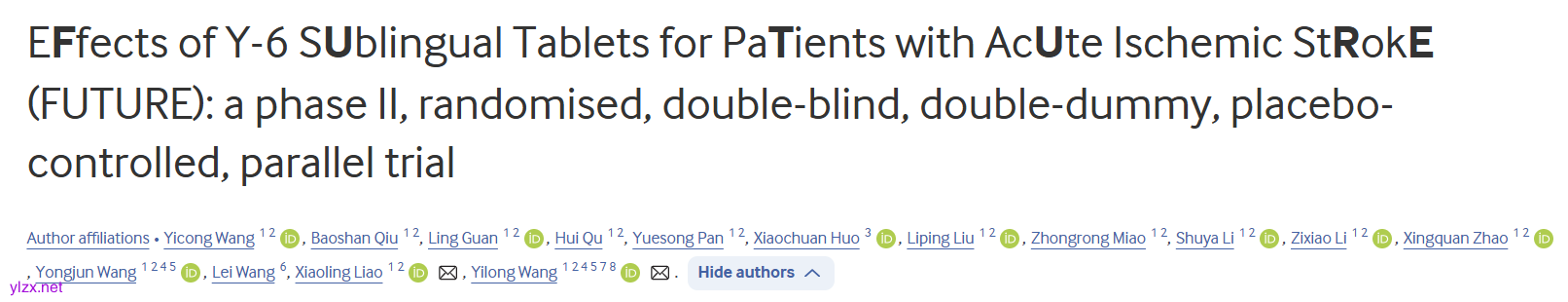 Yicong Wang, et al. EFfects of Y-6 SUblingual Tablets for PaTients with AcUte Ischemic StRokE (FUTURE): a phase II, randomised, double-blind, double-dummy, placebo-controlled, parallel trial: Stroke and Vascular Neurology 2025;:svn-2024-003666.