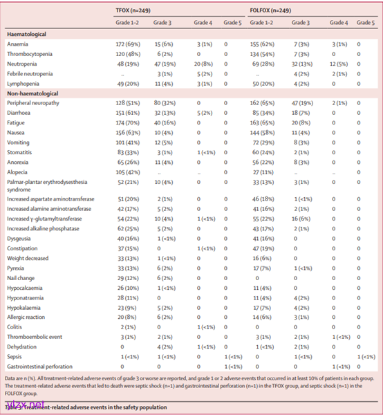最常见的3级和4级治疗相关不良事件包括腹泻(TFOX组37例[15%] vs FOLFOX组18例[7%])、周围神经病变(80例[32%] vs 49例[20%])、中性粒细胞减少(67例[27%] vs 44例[18%])和疲劳(40例[16%] vs 20例[8%])。严重治疗相关不良事件发生在TFOX组的66例(27%)和FOLFOX组的33例(13%)。TFOX组和FOLFOX组各有2例(<1%)和1例(<1%)治疗相关死亡。