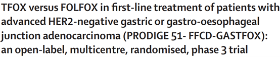 Aziz Zaanan, Olivier Bouché, Christelle de la Fouchardiere, et al. TFOX versus FOLFOX in first-line treatment of patients with advanced HER2-negative gastric or gastro-oesophageal junction adenocarcinoma (PRODIGE 51-FFCD-GASTFOX): an open-label, multicentre, randomised, phase 3 trial. The Lancet Oncology. 2025;25(4):https://doi.org/10.1016/S1470-2045(25)00130-5.