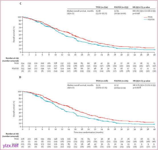 从2016年12月19日至2022年12月26日,共507例患者被随机分配至TFOX组(254例)和FOLFOX组(253例)。中位随访时间为42.8个月。TFOX组的中位无进展生存期(PFS)为7.59个月,FOLFOX组为5.98个月(HR 0.76,95% CI 0.62-0.93;p=0.0072)。TFOX组的中位总生存期(OS)为15.08个月,FOLFOX组为12.65个月(HR 0.82,95% CI 0.68-0.99;p=0.048)。TFOX组的客观缓解率(ORR)为62.3%,FOLFOX组为53.4%(p=0.045)。