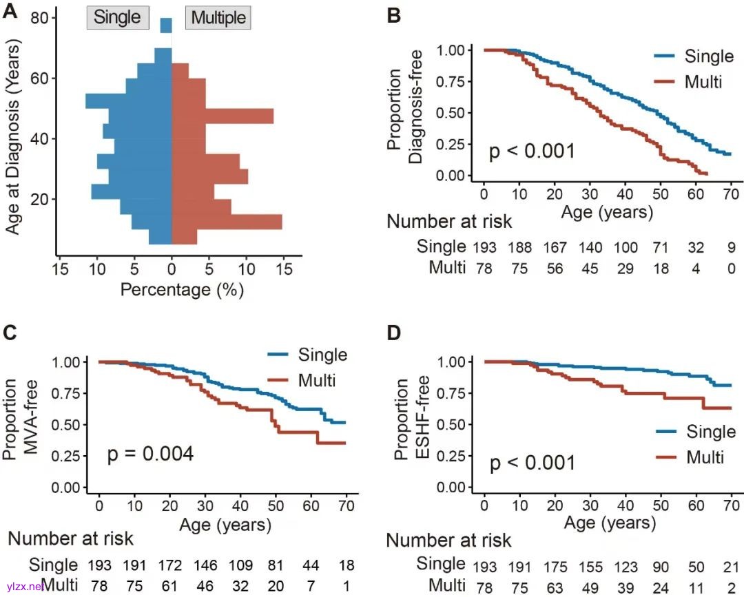 与其他ARVC致病基因显著不同的是,本研究充分首次证实DSG2/DSC2导致的ARVC患者中多重突变携带者比例高达28.8%,包括纯合、复合杂合和双基因杂合突变。多重突变携带者发病更早、恶性心律失常及致死性心力衰竭风险显著升高。