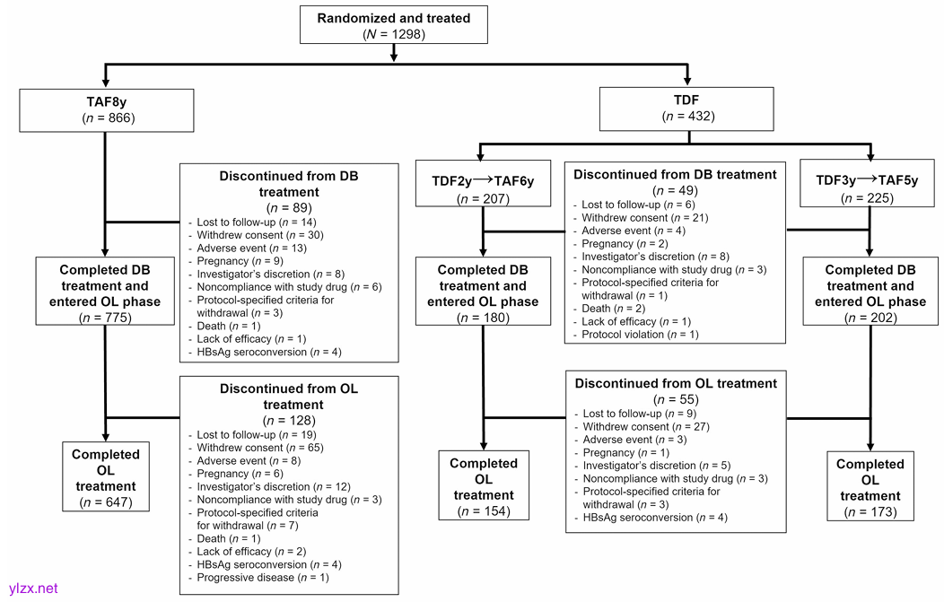 这项研究纳入了1298名HBeAg阴性和HBeAg阳性的CHB患者,并按照2:1的比例随机分配至TAF 25 mg/天或TDF 300 mg/天的治疗组,持续3年。随后,所有患者进入开放标签阶段(open-label, OL),统一接受TAF治疗直至第8年。研究设计允许初始接受TDF治疗的患者在第2年或第3年转换为TAF治疗。主要观察指标包括HBV DNA水平、病毒学应答率、血清学指标、肝脏纤维化变化以及骨密度(BMD)和肾功能等安全性参数的变化。此外,研究人员还通过深度测序和表型分析每年评估TAF的耐药性情况。数据分析采用“缺失等于失败”(missing-equals-failure)和“缺失等于排除”(missing-equals-excluded)两种方法以确保结果的全面性和稳健性。