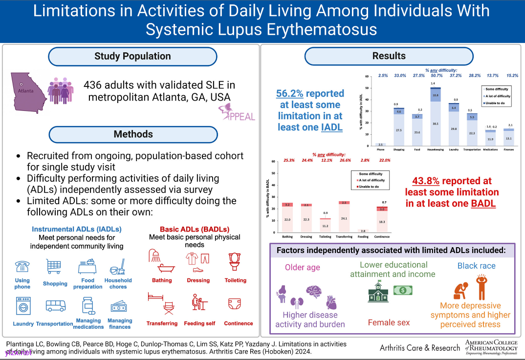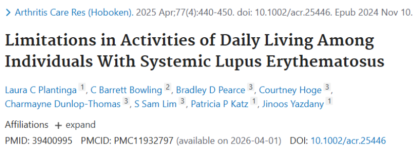Plantinga LC, Bowling CB, Pearce BD, Hoge C, Dunlop-Thomas C, Lim SS, Katz PP, Yazdany J. Limitations in Activities of Daily Living Among Individuals With Systemic Lupus Erythematosus. Arthritis Care Res (Hoboken). 2025 Apr;77(4):440-450. doi: 10.1002/acr.25446. Epub 2024 Nov 10. PMID: 39400995; PMCID: PMC11932797.