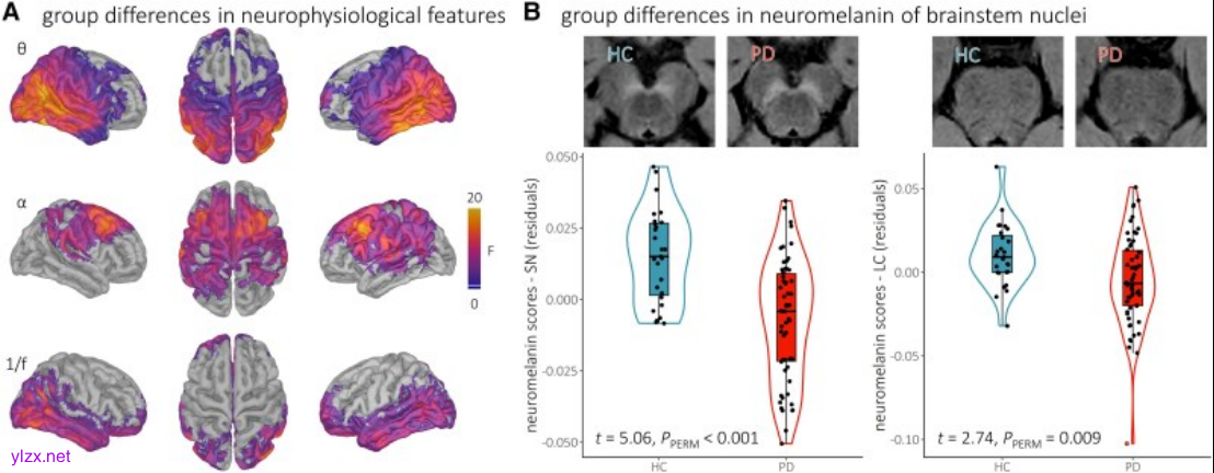 使用一种新的多模式方法报道了α和β波段皮质神经生理学与 PD 脑干核中富含神经黑色素的细胞的退化存在差异关联。数据显示β活性与SN 中多巴胺能神经元的丢失有关,α活性与 LC 中去甲肾上腺素能细胞的耗竭有关。α活性与 LC 神经黑色素最密切相关的皮质区域也具有较高浓度的去甲肾上腺素转运蛋白。发现在α活性和 LC 神经黑色素之间表现出强烈关联的皮层区域也是α活性随注意力障碍的严重程度而变化的区域。在区域β活性与SN神经黑色素相关的区域,更强的β活性预示着更严重的轴向运动障碍。
