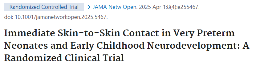Kristoffersen L, Støen R, Bergseng H, Flottorp ST, Magerøy G, Grunewaldt KH, Aker K. Immediate Skin-to-Skin Contact in Very Preterm Neonates and Early Childhood Neurodevelopment: A Randomized Clinical Trial. JAMA Netw Open. 2025 Apr 1;8(4):e255467. doi: 10.1001/jamanetworkopen.2025.5467. PMID: 40238094; PMCID: PMC12004208.