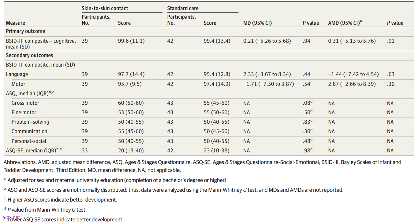 主要终点:SSC组(n=51)与标准护理组(n=57)在2-3岁时的BSID-III认知评分无显著差异(平均差0.21分,95%CI -5.26~5.68,P=0.94)。两组神经发育延迟风险比例相近(SSC组51% vs 标准组49%,OR=1.10,P=0.83)。