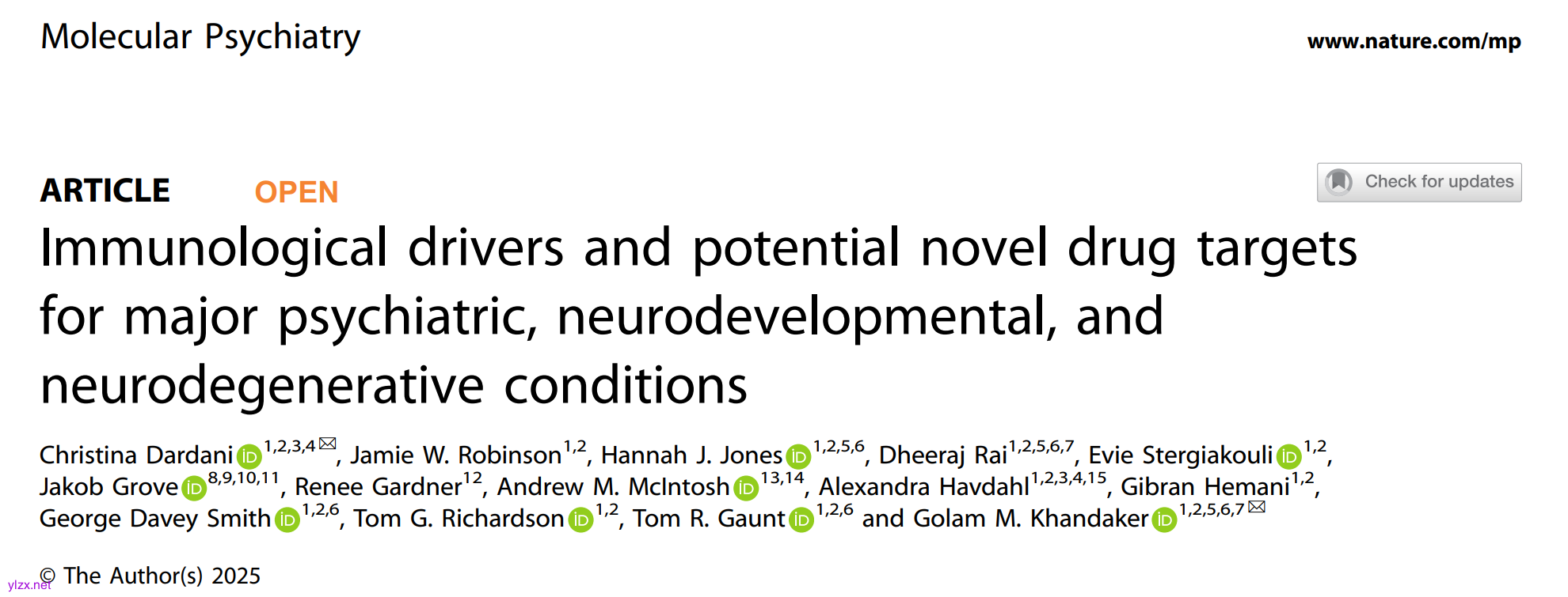 Dardani, C., Robinson, J.W., Jones, H.J. et al. Immunological drivers and potential novel drug targets for major psychiatric, neurodevelopmental, and neurodegenerative conditions. *Molecular Psychiatry* (2025). https://doi.org/10.1038/s41380-025-03032-x