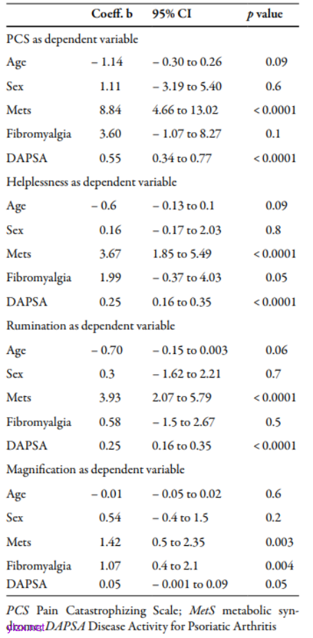 本研究为单中心横断面观察性研究,纳入170例符合CASPAR标准的PsA患者,其中42.94%合并MetS(基于NCEP-ACT III标准)。通过标准化问卷收集人口学特征、疾病活动度(DAPSA、BASDAI、MDA/VLDA)及PC评分(疼痛灾难化量表PCS,涵盖无助感、反复思虑、放大反应三个维度),同时记录代谢指标(腰围、BMI、血压、血脂、血糖)。统计分析采用单变量及多变量线性回归(校正年龄、性别、纤维肌痛、DAPSA),使用Stata v.14软件,显著性阈值设为p<0.05。研究经伦理委员会批准,遵循《赫尔辛基宣言》。