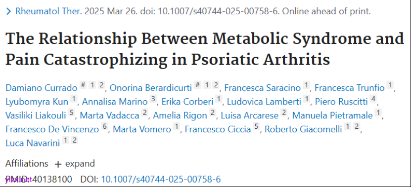 Currado D, Berardicurti O, Saracino F, Trunfio F, Kun L, Marino A, Corberi E, Lamberti L, Ruscitti P, Liakouli V, Vadacca M, Rigon A, Arcarese L, Pietramale M, De Vincenzo F, Vomero M, Ciccia F, Giacomelli R, Navarini L. The Relationship Between Metabolic Syndrome and Pain Catastrophizing in Psoriatic Arthritis. Rheumatol Ther. 2025 Mar 26. doi: 10.1007/s40744-025-00758-6. Epub ahead of print. PMID: 40138100.