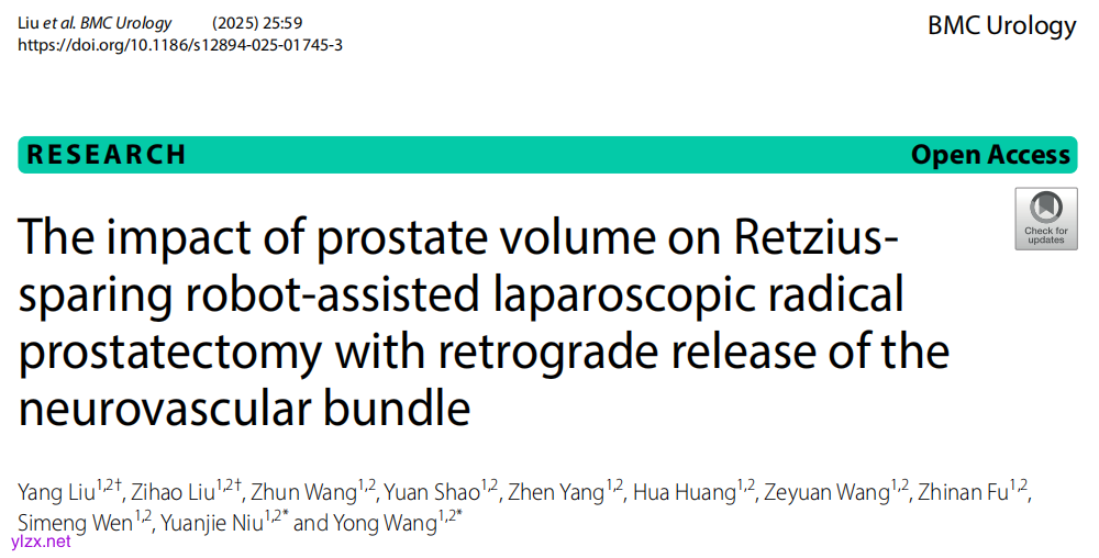 Liu Y, Liu Z, Wang Z, Shao Y, Yang Z, Huang H, Wang Z, Fu Z, Wen S, Niu Y, Wang Y. The impact of prostate volume on Retzius-sparing robot-assisted laparoscopic radical prostatectomy with retrograde release of the neurovascular bundle. BMC Urol. 2025 Mar 27;25(1):59. doi: 10.1186/s12894-025-01745-3. PMID: 40148825; PMCID: PMC11948973.