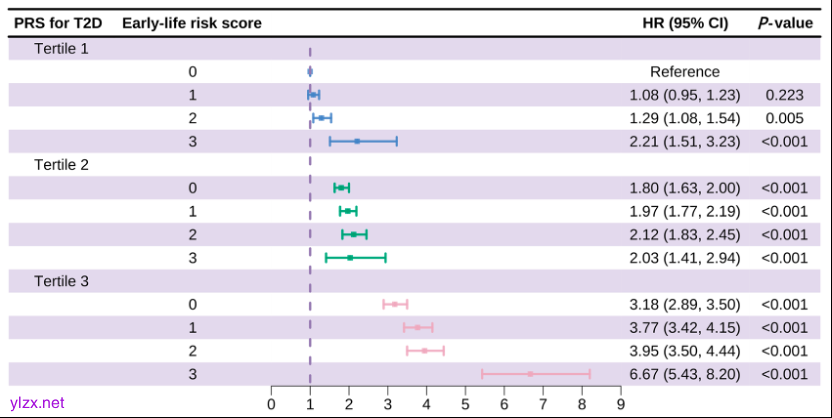 较高的T2D-PRS与较高的T2D风险相关。在联合暴露分析中,研究观察到在完全校正模型中,随着早期生活风险因素数量的增加,所有PRS水平的T2D风险均呈现出持续的正向单调递增趋势。其中,暴露于最多早期生活风险因素(ERS=3)且T2D-PRS较高(第三等级)的个体风险最高(HR:6.67;95% CI:5.43,8.20),相比之下,无早期生活风险因素(ERS=0)且T2D-PRS较低(第一等级)的个体风险则较低。